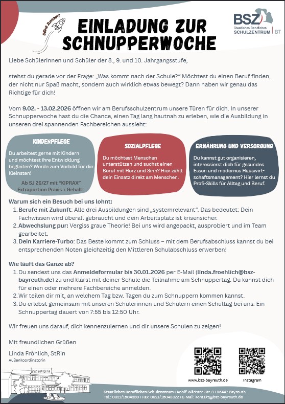 Schnupperwoche vom 09.-13.02.2026 Melde dich bitte bei linda.froehlich@bsz-bayreuth.de an: Anmeldung zum Schnuppertag Wir freuen uns auf dich!