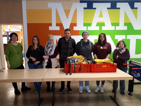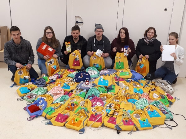 Dort wurden sie von den fleißigen Näherinnen und dem Näher der Berufsfachschule für Ernährung und Versorgung 12 an die dortigen Schüler zum Befüllen ausgeteilt.