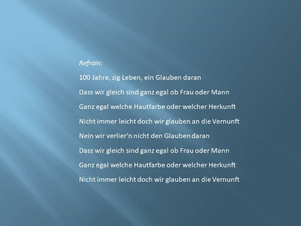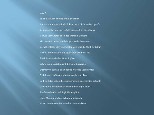Alles begann mit der Recherche einer 11. Klasse der Ernährung und Versorgung (Schuljahr 17/18) zum Thema Entwicklung der Frauenrechte in den letzten 100 Jahren. Hierzu entwickelten die Schüler selbstständig einen Fragebogen (siehe Textdatei). Dieser war Grundlage für die Befragung einer Zeitzeugin, deren Geschichte wiederum die Ausgangslage unserer weiteren Arbeit darstellte (siehe Textdatei).