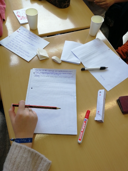 Dienstag, der zweite Herbstferientag 8:40Uhr (Schuljahr 18/19). Wir (Lehrkräfte: Kathrin Böttler, Sina Eylers) kommen in der Schule an und blicken in interessierte und erwartungsvolle Schüleraugen. Insgesamt 25 Schüler aus allen 3 verschiedenen Fachbereichen haben sich motivieren können freiwillig in den Ferien das Schulhaus zu betreten. Nach einem kurzen Einstieg der Lehrkräfte legte Frank Pirner (Rapper) los, der den Schülern direkt das „Du“ angeboten hatte. Wie ist ein Song eigentlich aufgebaut, wie viele Silben passen in eine Zeile und wie viele Takte hat ein typischer Rapsong? – Crashkurs Songschreiben. Nachdem 5 Gruppen ausbildungsübergreifend gebildet waren, ging es ans Eingemachte. Die Gruppen beschäftigten sich mit der Vergangenheit und der Gegenwart der Frauenrolle sowie der Entwicklung von der Hausfrau zur Fachkraft. Eine weitere Gruppe überlegte sich, wie die Zukunft diesbezüglich aussehen soll. Ein lockeres Beisammensitzen mit Keksen und Kaffee lockerte die sonst eher steife und uncharmante Schulatmosphäre auf. Nach dem ersten Brainstorming machte Frank Pirner den von ihm ausgewählten Beat an, betreute die Gruppen und unterstütze sie in ihrem Arbeitsprozess. Nach 3 Stunden war die gröbste Arbeit getan, die Schüler waren überaus produktiv und alle mit dem ersten Ergebnis sehr zufrieden. So kann es weiter gehen!