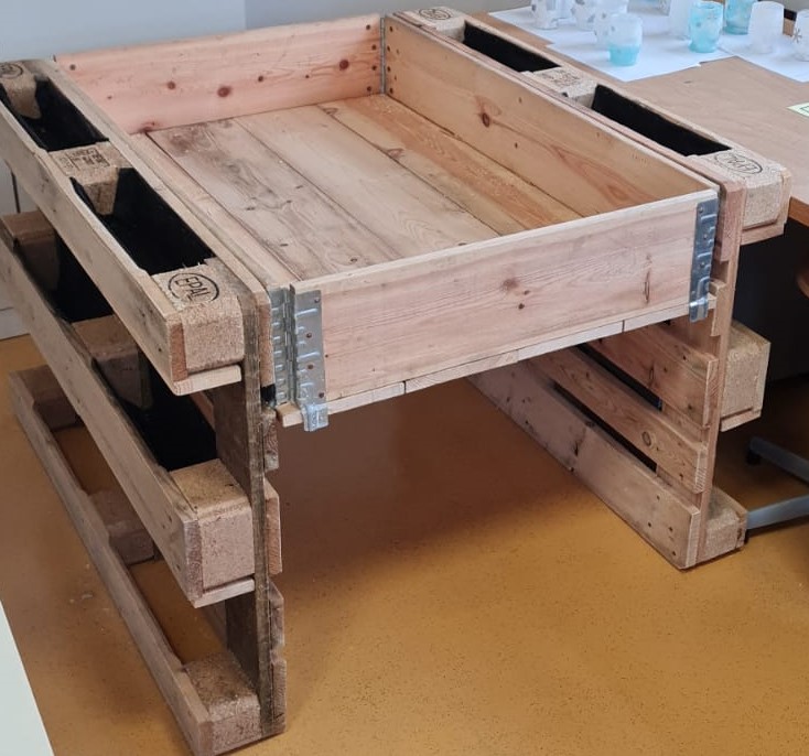 Hochbeete für die Schulküchen – Umweltschule Im Rahmen der Umweltschule baute die Gruppe 2/ der BEV 12 im Fach Projektorientiertes Arbeiten mit Frau Hirschmann Hochbeete aus Europaletten.