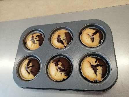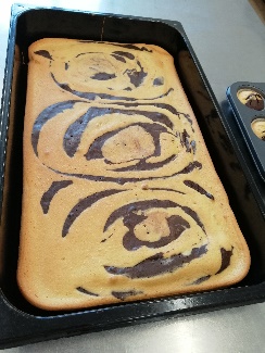 Als erstes bereitete ich einen Zebrakuchen vor. Hierfür habe ich alle benötigten Zutaten abgemessen und in die Küchenmaschine gegeben. Nachdem der Teig eine gute Konsistenz hatte, habe ich den Teig in zwei Schüsseln verteilt und in die eine Hälfte Kakao gegeben, für den Zebra-Effekt. Aus einem Teil des hergestellten Teiges, habe ich Muffins zubereitet, denn diese sind sehr leicht zu essen und somit perfekt für das Büffet geeignet. Den restlichen Teig habe ich auf ein Gastronorm-Backblech gegeben. Einmal hellen, einmal dunklen Teig. Diesen Vorgang habe ich so lange wiederholt, bis ein Zebra-Muster entstand. Dieser Kuchen ist besonders wegen der Optik sehr beliebt bei Kindern.