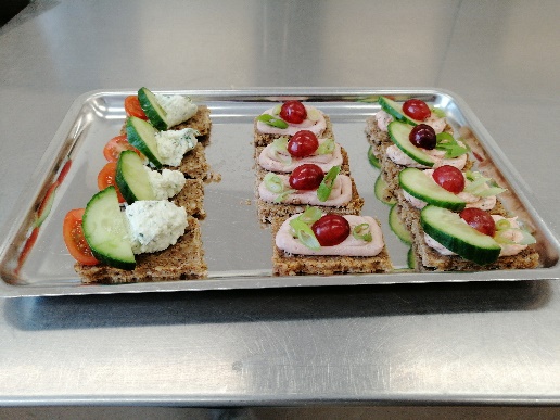 Meine nächste Teilaufgabe war es, verschiedene Brotaufstriche zuzubereiten. Ich habe mich für einen Feta-Kräuter-Aufstrich, einen Leberwurst-Quark und einen Lachsaufstrich entschieden. Diese Kombination habe ich gewählt, da ich durch einen vegetarischen Aufstrich und einen Aufstrich mit Fleisch und Fisch, eine vielseitige Kombination schaffen konnte. Die verschiedenen Aufstriche habe ich auf die Brotschnitten mit einem Spritzbeutel aufgespritzt, damit die Häppchen ansprechend aussehen.