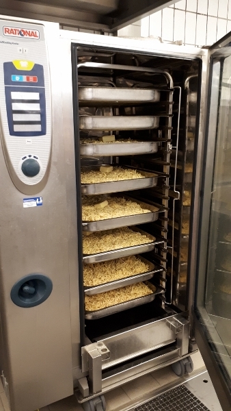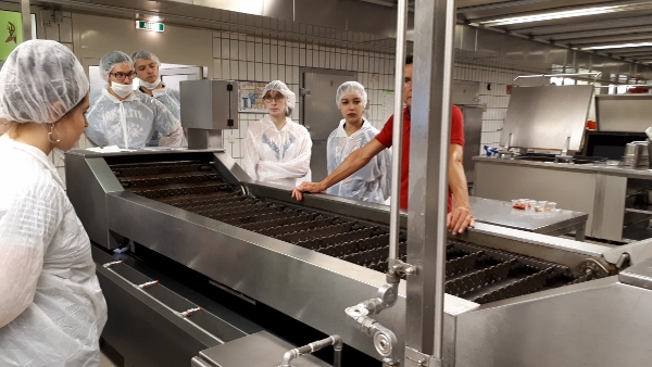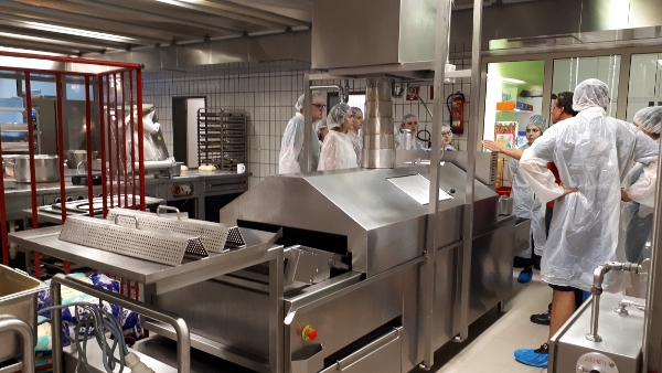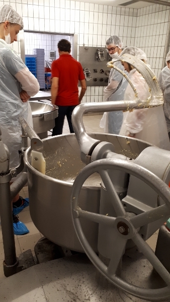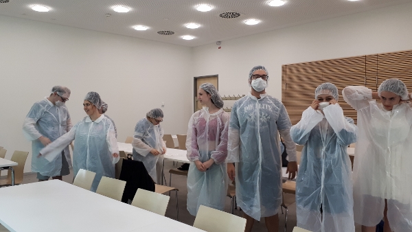 Wie es sich für einen Besuch in einem Lebensmittelbetrieb gehört, wurden wir zunächst eingekleidet (Kittel, Haube, Überzieher für die Schuhe). Dann durften wir die Großküche, in der 60-70 Mitarbeiter beschäftigt sind, betreten.