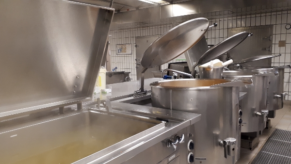 Vorbei an der Frittierstraße (die mit 200 Litern Öl befüllt wird), der Bratstraße, die Schnitzel brät, dabei wendet und hinten perfekt gar ausgibt, Kippbratpfannen mit enormen Ausmaß…