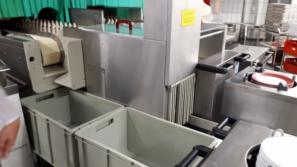 Sehr imposant war auch die Spülstraße, die das Tablett mit Teller und Besteck komplett aufnimmt, abräumt, spült und die einzelnen Komponenten getrennt in Kisten abgibt.