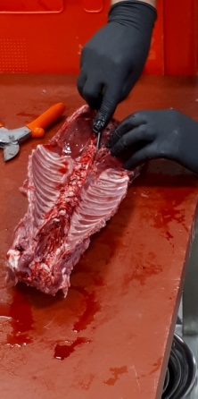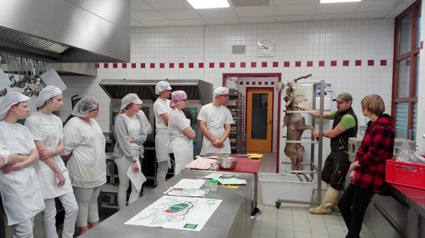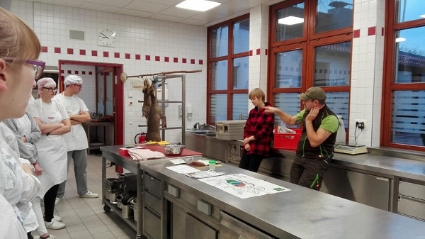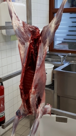 Dann ging es schon in die Praxis- das Abziehen und Zerlegen des Tieres. Interessierte Schüler durften die Fleischteile mit auslösen.