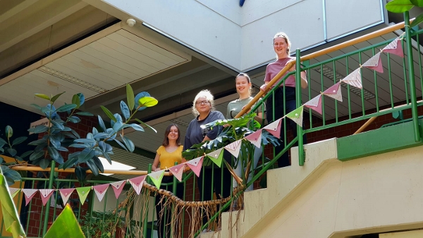 Bunte Stoffe wurden zugeschnitten, zusammengenäht, gebügelt, mit einem Knopf versehen und schließlich zu farbenfrohen Wimpelketten für die Aula und das Bistro zusammengefügt.