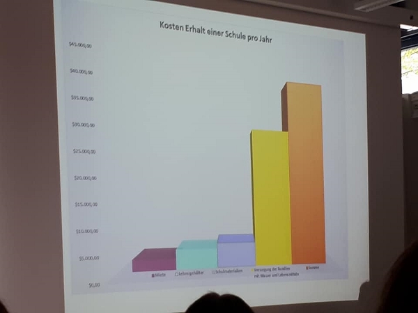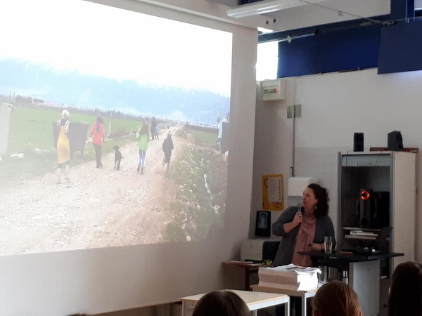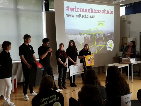 Kurz stellten wir unser Projekt vor- das Nähen der 120 Taschen, den Muffinverkauf und die anderen Aktivitäten, durch die wir Geld für die Zeltschule sammelten.