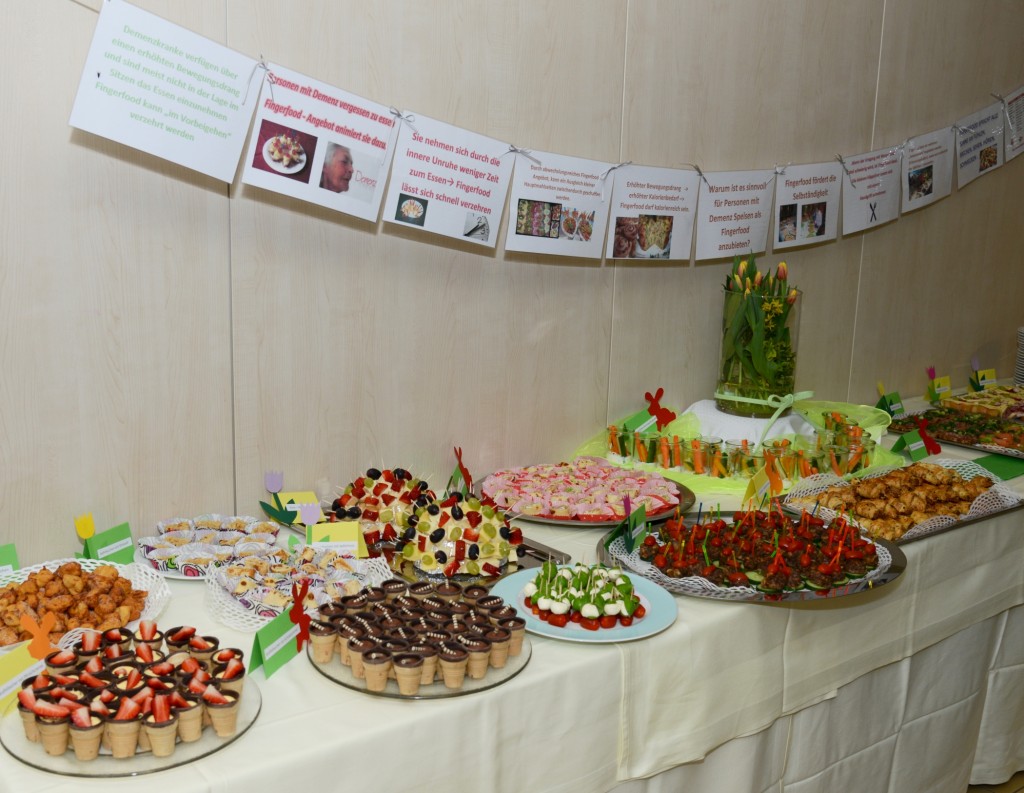 Am 7. April 2014 konnten Schüler und Lehrkräfte des BVJ 3, „Gastronomie und Sozialpflege“ die Früchte ihrer wochenlangen Arbeit ernten. An diesem Tag wurden rund 40 geladenen Gästen die Ergebnisse des Projekts „Fingerfood für Menschen mit Demenz“ präsentiert. Ein aufwendig gestaltetes Finger-Food Buffet, eine Beschäftigung, Plakate sowie fachkundige Beiträge zum Thema Demenz waren die Hauptattraktionen des Projektabends, einer Veranstaltung, auf die sich die Schüler des BVJ 3 wochenlang eifrig vorbereiteten.